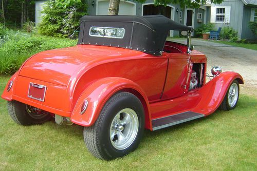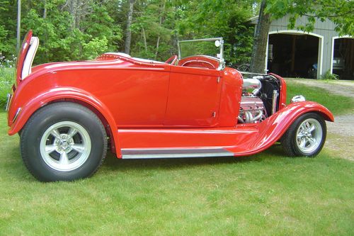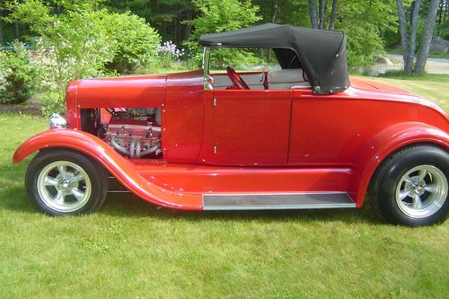 1929 Ford Roadster. Body by Heritage, Built up 350 engine with mild cam and Camel Heads, Disc Brakes Front, Drum Rear, 350 Transmission, 9 inch. Rear, 32 Grill Shell, Chrome Drop Front Axle, Tilt Wheel and Telescoping Wheel, American Racing Wheels, Roll and Tuck Interior, Rumble Seat as well. It has painted side panels but haven't been fitted to the car. All that would be needed are the hold down latches which are available for about $60. Dollars. This is a fresh built with low miles. Just enough miles to be checked out. There is a video on You Tube. Go to the You Tube site and type in wayne6483 and all my videos should come up.