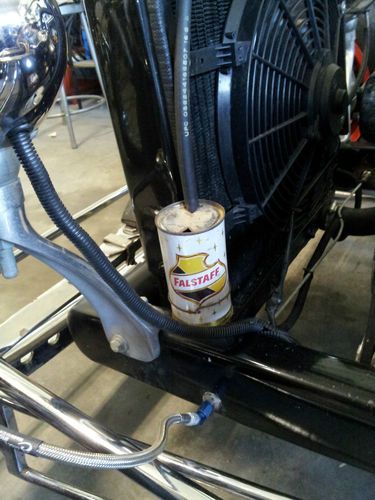 This little sucker is one fast and fun T Bucket. It's running a Chevy 350 engine with a "little" cam that gives it just the right lumpity lump, turbo 350 transmission, B&M Quicksilver shifter, Dana 41 rear end, dropped drilled beam up front with discs brakes. Dash has all the usual gauges....Speedo, Tach, Oil Pressure, Temp, and Volts...no gas gauge but you can look in the tank while sitting in it. The engine runs nice and cool even when its super hot outside.....there is an electric fan with switch just in case the temp climbs. The wiring and fuse block are under the seat, the interior is charcoal and black, with black carpet. Body is fiber glass and does have a few chips and a little spider webbing, paint is a dark charcoal, that looks black until the sun hits it, and as an added bonus, there is a door on the passenger side. Nice headers down the side with mufflers gives it a nice rumble, but not too loud.....well actually it is kind loud! Aluminum tank out back, red wheels with chrome trim, and fat white walls all around. Of course there is the standard AHOOGHA horn and an added bonus....a wolf whistle! It starts right up, runs great, and is the best steering T Bucket I have owned.....oh and it will light the tires in any gear when ya push on the go pedal.