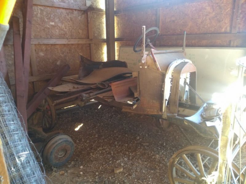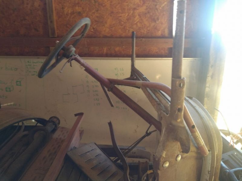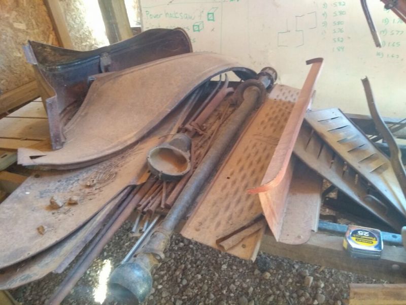 Ford Model T Frame, front and rear ends, fenders, steering column, wheels, engine shroud and various parts.