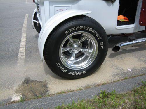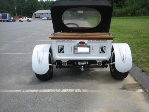 The lifelong and current owner skillfully built the car in 1970 and the vehicle is fully documented as such. Performance: The engine is a 3.8 V6 Chevrolet from the era of it's build. While the engine is mostly stock there is a Holly Street Dominator Carb and Intake Manifold. There are also long tube headers that go into side pipes. The exhaust sounds very deep . Were not sure how much horsepower the engine is making but the car has no problem getting to 100mph. Around town she's a blast to drive. The transmission is a turbo 350. Brakes are non-abs drums and stop the vehicle in a controlled, smooth fashion. The suspension is springs and shocks. Body: The interior upholstery and exterior paint were all done in 2012 by Mikes Auto in Gardner, MA. The finish is flawless in a creamy white gloss with tasteful red pin striping.This vehicle is in excellent shape. The undercarriage is very clean, the frame needs nothing. Unique Touches: The front fenders are not fixed. This custom job allows the great looking front fenders to turn with the wheels. The front turn signals are in the style of retro lamps. There are tastefully installed purple undercarriage lights that look great at night with the white paint. There is a POW tribute theme on the rear of the vehicle. Professionally stored in the winter. If you have any questions feel free to ask Sold as is |