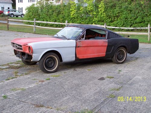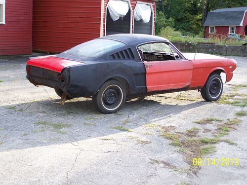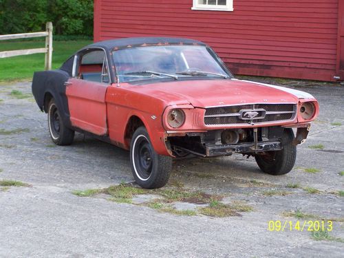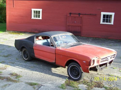 1965 Mustang Fastback project car.Just pulled this one out of the barn. DSO is Los Angeles Ca.This car is a great project for the experienced body man or restoration shop. It would be a nice Shelby GT350 replica. Originally it had a six cylinder,it was changed over to a 289 V8 a long time ago.Door glass is all there. Original color is Poppy Red.The rear quarters are original,although they need to be replaced.Fold down seat is in the car.What you see is what you get or just ask. Mustang fastbacks never go out of style !