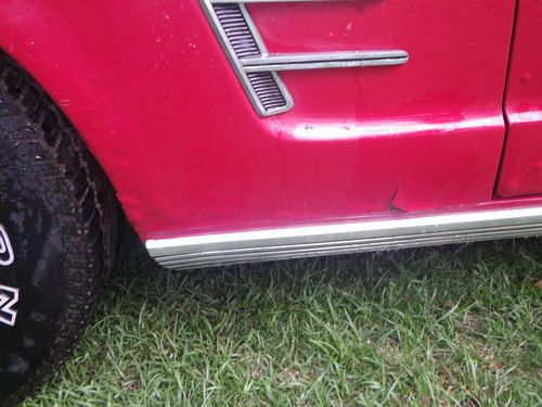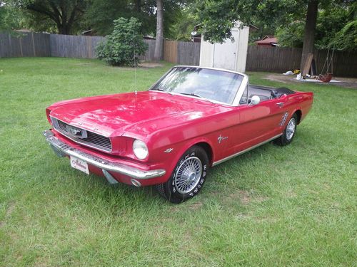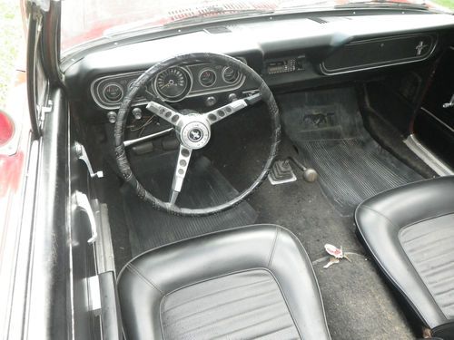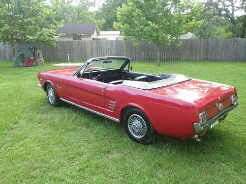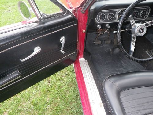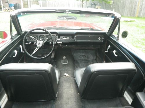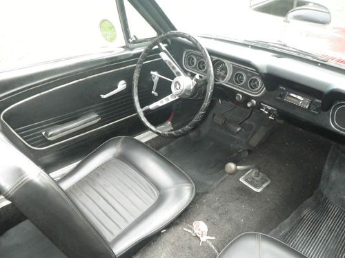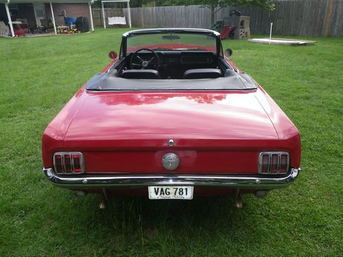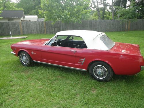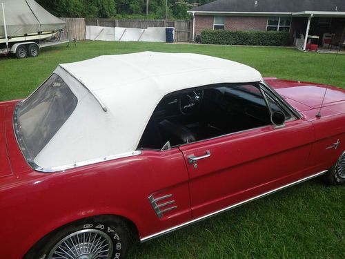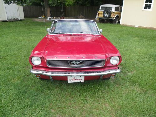 Up for auction is a 1966 Mustang Convertible. This is being relisted due to the high bidder placed bids on several cars then retracted his bid on my car after winning the bid on another. This would be a good one to restore. It has curb apeal already as it sits. It is a numbers matching candy apple red convertible with black interior, 289 engine with 3 speed transmission. The paint looks good from afar, but at a closer look there are bubbles in the paint and some rust spots on the bottom of the doors and around the rear wheels. I have new lower panels to replace the bottom of the doors. It will crank up and run, but will not idle. The brakes need work, possibly a new master cylinder. It needs a new exhaust. The interior is in good original condition with exception of the carpet. The top is in good shape but need a new back window. Bottom line is I think this car could be a pretty easy restoration. I do not have a title for this car. Alabama does not issue car titles for cars that are more than 35 years old.
