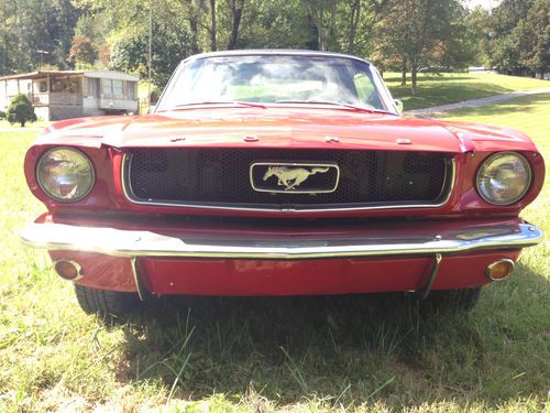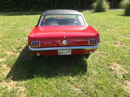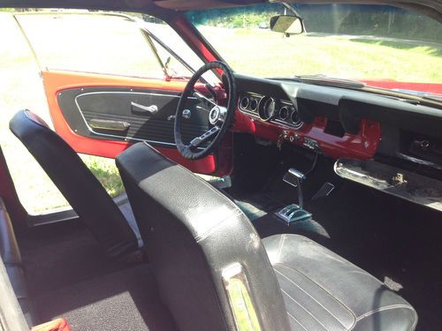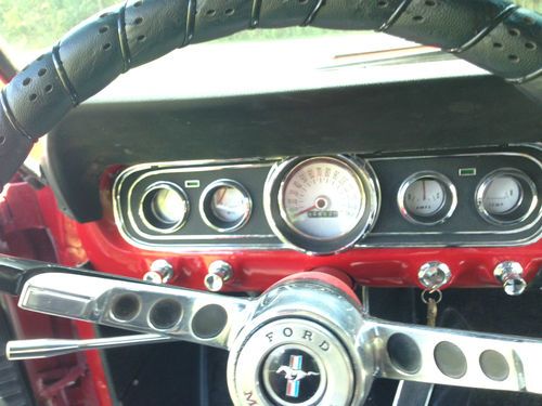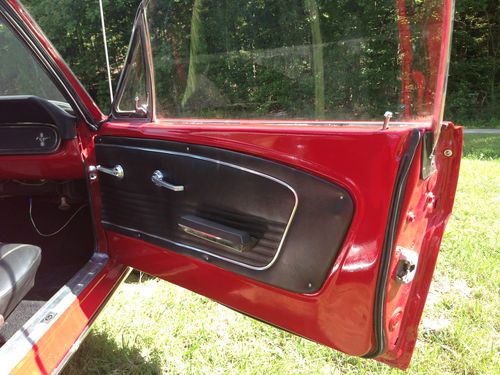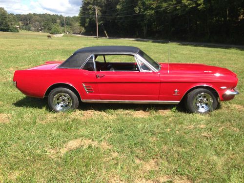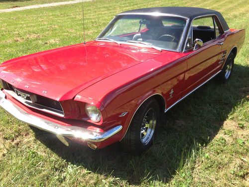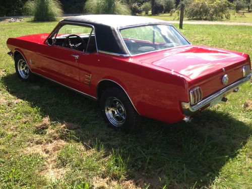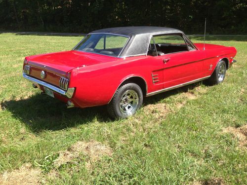 Up for auction is a GREAT 1966 Mustang. This is not a show car but makes for a wonderful daily driver! It recently had a Candy Apple Red paint job that looks great (8/10) with new exterior emblems and some new exterior chrome (antenna, door handles, door locks, ect.) The vinyl top is in great condition and still has a good deep black color to it. This Mustang is sitting on a brand new pair of Triangle Tires and new Cragar 14 inch wheels that has less than ten miles on them. Glass is all around in good shape, back window does have some scratches. All windows roll up and down with no issues. Underneath the car is brand new exhaust and muffler system from the engine headers back, has that great Mustang sound to it! Floor plans have been replaced at some point. The engine was pulled and had work including new engine paint, new upper and lower engine hoses, new heater hoses, new transmission lines, and new engine valve seats installed.