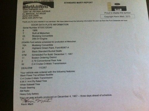 I'm selling nice quality almost show room condition " Ford Mustang Convertible" 1968. Car is in excellent shape and drives without any rattles or shakes. Car has power top with brand new top that was installed last year. Top shows some wrinkles on back area, to be honest installer messed up, but i'm sure that can be adjusted. Engine and transmission is original to the car, and it was rebuilt by previous owner. Brand new ball jojnts, idler arms, bushing kit, full grease tub+ Alighment installed in 2012 have receipt- see picture. Also car has disc brake kit installed. Car has power steering, 4 bbl carb. Overall car is in excellent shape there nothing that you can complain about- This is almost 50 years old car. Buyers this car is listed locally so i reserve the right to end this auction at any time. Buyer is responsible for pick up/shipping- I can assist in shipping. I request $500 deposit immediately after auction is closed. Deposit is NON- REFUNDABLE - This is to weed out scammers that dont pay for cars. Please only serious buyer with available funds. Full payment is required within 3 days either cash in person, certified check, wire transfer. Car will be released after funds clear my bank. I will provide clear open Massachusetts title and bill of sale. ALSO car has installed brand new seats from mustang unlimited, Pro sports with recliner and headrests valued at $599.99. Please free to send me offer I'm willing to end auction early if correct offer comes in. Good luck bidding. I will send more pictures or videos on request just provide e-mail or phone number so i can text videos/pic to your phone.