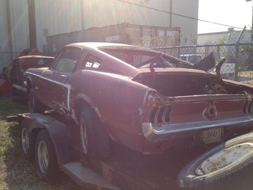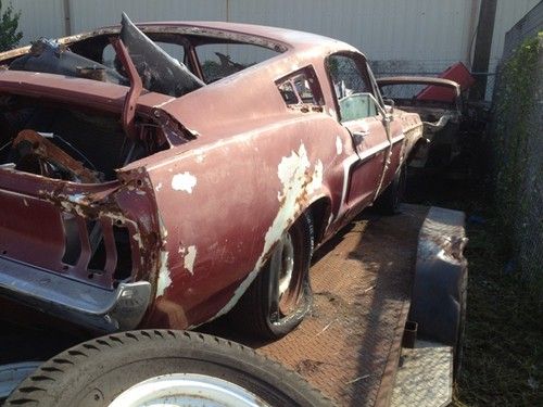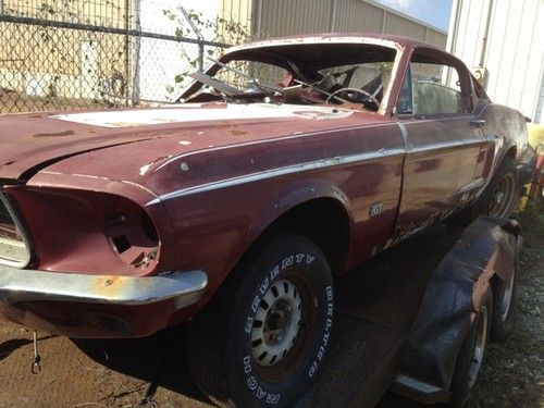 1968 Ford Mustang "C" code fastback - this Mustang was built in 1984 using every option offered by Ford in 1967 and 1968 including GT package, both consoles and ribbed taillight panel. It was driven 200 miles before the engine developed problems. The car has been sitting since the summer of 1985. Orginally a 289 car, it was built with a 390 tri-power and 4 speed. The 4-speed and 8 inch rearend are stil in the car. Motor and tri-power have been gone for years. I have found 3 of the 4 styled steel wheels. Car has front disc brakes. I have not inventoried the car, but can see the folddown seat, GT grille with foglights. and misc parts inside. The car does need another restoration of used for parts. Car does have a clean title in owners name. Will help with loading for transport. Contact through Ebay or call 504-460-7127 for more information.
