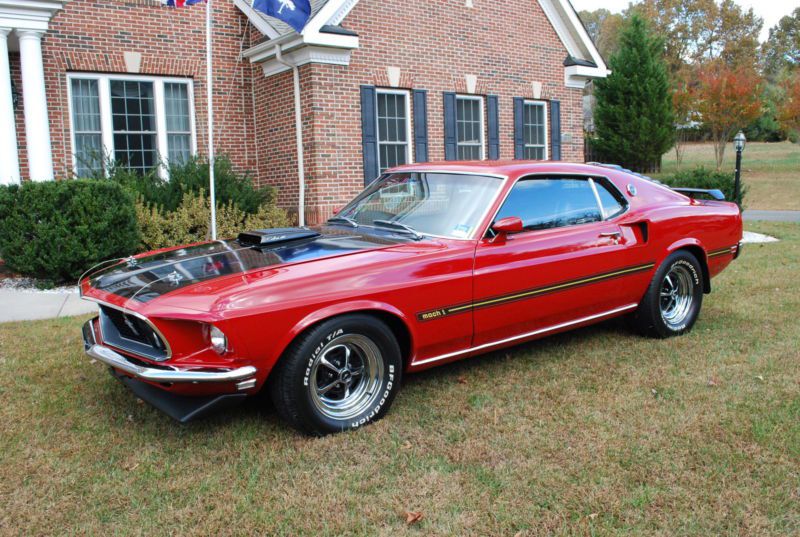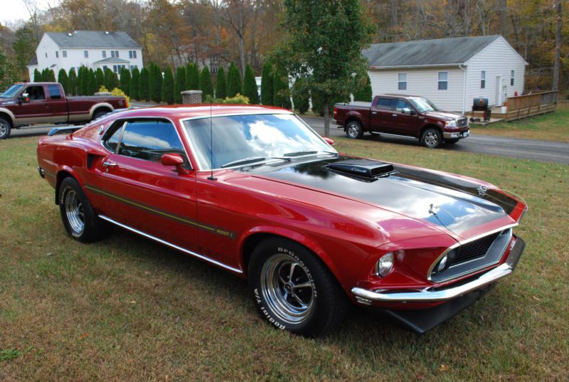 Offered for sale is my 1969 ford mustang 428 cobra jet Mach 1. This Mach 1 is equipped with the r code 428 cobra jet engine backed by a close ratio toploader 4 speed transmission and a 3.50 traction lok 31 spline nodular rear end. This is a nicely equipped car and is optioned with power disc brakes and power steering, tinted glass, factory tach, fold down rear seat, visibility group and AM/FM cassette stereo radio. Additional owner added options include front and rear spoilers and window slats. The car rides on 15 inch Magnum 500 wheels with BF Goodrich P215/65R15 T/A radials. The odometer reads 05520 and assumed to be 105520 however that is not able to be verified.
