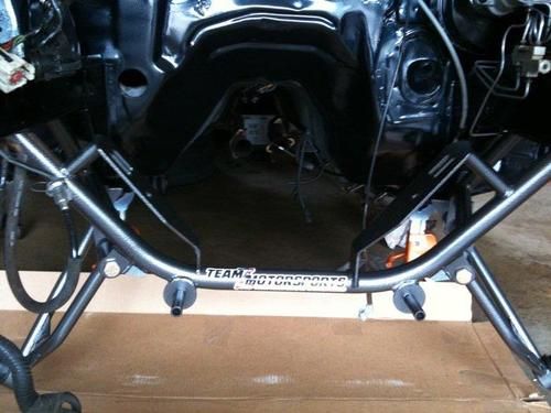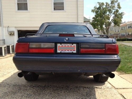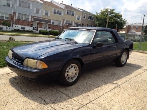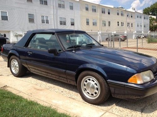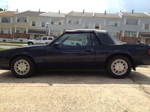 1989 Mustang LX convertible, dark blue, with newer dark blue top and grey leather interior; exterior and interior of car is in average condition for age. Newly painted engine compartment, brand new Team Z tubular k-member kit with tubular a-arms and all poly bushings, Hyper coil 12-185 springs, Strange adjustable coil overs, Strange 10-way adjustable struts, Team Z caster camber plates, new energy suspension motor and trans mounts, front brakes, new heater core, radiator, water pump, ignition switch, motorsport plug wires, new plugs, Accel cap and rotor. Exhaust includes BBK shorty headers, off-road h-pipe, and Flow-master exhaust. New manifold, valve cover, and oil pan gaskets, new clutch fork, new clutch cable with dual adjustment at fork and at firewall with billet aluminum adjuster and billet aluminum clutch quadrant. Smog pump and EGR deleted but car does have A/C(compressor seal leaks oil). The last picture is of the new front suspension before re-installing the engine. The car is completely back together and the long block is stock, heads were not removed. PA Inspection good until 4/2014.