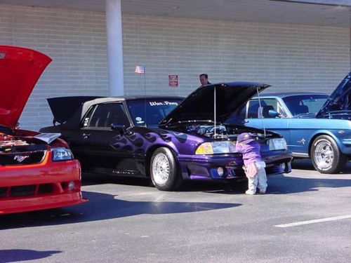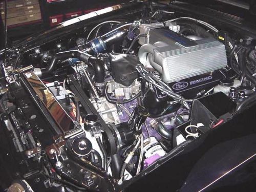 & 160 DEG thermostat, Ford Motorsports 4.10:1 rear end gear, Auto Meter competition instruments, B & M Hammer shifter, B & M shift improvement kit, B & M transmission cooler, Three row radiator, Ford Motorsports suspension springs, Gabriel gas shocks and struts, BBK "shorty" headers, BBK 2 1/2" off road pipes, Flowmaster "Cat-Back" exhaust system, TCI "Street Fighter" torque converter, 2 1/2 " cowl hood by Cervini's, Steeda roll bar, Ford Motorsports 5.0 L G.T. 40 manifold, Ford Motorsports F-303 camshaft, March Underdrive Pulleys, BBK cold air induction kit, K & N air filter, BBK 70 mm throttle body, Pro-M 75 mm mass air meter, Air conditioner eliminator kit, Ford Motorsports valve covers, 9mm Ford racing plug wires, Flex-a-lite "Black Magic" electric fan, Painless switch panel, Flaming River battery relocation box and remote battery
