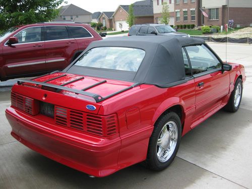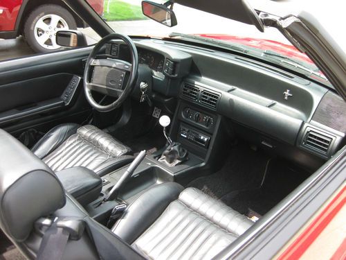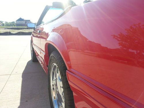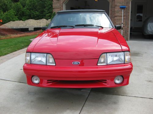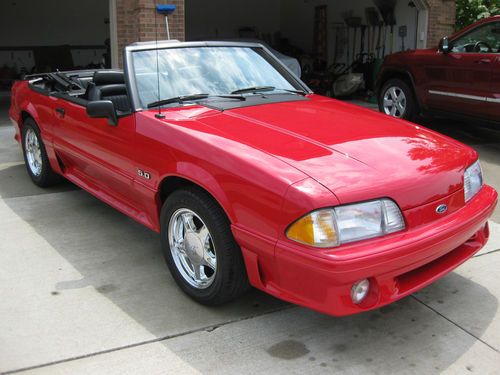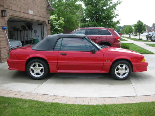 1991 Mustang GT Convertible - High end driver quality condition. I have owned her since 1998. Body is solid, which includes floors, trunk, doors truck deck lid and hood. Never any rust. The car has never been in a serious accident. When I purchased the car it was all original. I decided to restored the car with a complete new paint job about 6 years ago with the original bright red. Everything was removed from the body when the repaint was done. This was done by a professional custom paint guy with PPG paint. The interior is all original black leather. The convertible top was replaced 6 years ago as well. The motor and transmission are original as well with 95,500 miles. The motor has never been modified and is all stock. Here is a list of all the options etc: - Power windows, locks, mirrors and convertible top. All work perfect. - Factory A/C (needs to be recharged) - Cruise Control (Does not work) - Black leather seats with power lumbar - 3:73 rear diff with factory limited slip - Air Induction air filter system - MSD ignition module and MSD coil and Distributor - Custom tuned larger Mas airflow sensor - Edelbrock Throttle Body - 3 core Aluminum Radiator - Electric flex-a-lite Fan - High Output Alternator - Heavy Duty Ford Motorsport Clutch ( replaced 6 years ago) - Heavy duty adjustable aluminum clutch quadrant - Ford Motorsport Headers - H Pipe (not Cats) - 2.5 in Dynamax Exhaust system - welded sub-frame connectors - Chrome 16 in Pony Rims - New Dunlop Tires - Hurst Shifter - New Rack and pinion - New Springs and Shocks - Alpine Stereo with 6 CD Changer - Run Mobil 1 synthetic oil since 1998 Many more upgrades to much to list! Every option works except the A/C and Cruise Control. I believe that the A/C needs to be recharged and I have never looked into the cruise control. I have never had a problem with this car. The motor runs very strong and the T5 shifts smoothly. She is a blast to drive and always gets the thumbs up! There are not many of these fox bodies around especially in this good of original condition. SERIOUS BUYERS ONLY!! IF YOU ANY FURTHER QUESTIONS PLEASE SEND ME A MESSAGE OR GIVE ME A CALL AT 313-706-8011, COME TAKE A LOOK AT THE VEHICLE YOURSELF, YOU WILL NOT BE DISAPOINTED! PAYMENT IN CASH OR BANK WIRE TRANSFER.