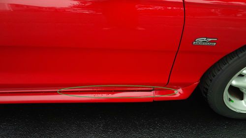 The passenger-side rocker trim piece is pulled away from the rocker panel by about 1/2 inch and has some stress-marks in the paint. It's been that way for a while and has remained in place without getting worse. It is shown and circled in one of the pictures.