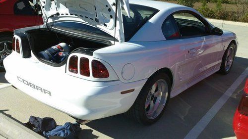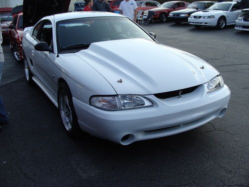 1996 Mustang GT 4.6L, Cobra clone. White exterior paint, excellent condition Corbeau Racing Seats interior. No back seat, carpeted ledge. Long tube headers, Nitrious kit (never used brand new), Cams, King Cobra Clutch, Deep Dish back rims, drag radial tires on back only. Aluminum drive shaft, flowmaster exhaust system, Ford Racing 3:73 Rear Gear, Pillar Gauge Pod & Dash Gauge Pod. Cold A/C, CD player, Double Cowl Hood w/ Hood Pins. New Leather Steering Wheel. Saleen Cobra Back Fender. Odometer not working. Bought car in 2003 with 67,000 original miles, hardly driven by current owner. Odometer currently reads 75,700. Estimated mileage to date = 80,000. Best of the best parts. All work performed by LaMotta Performance. Awesome fast car. All original receipts included for all work and parts. Reason for selling: Owner unable to drive due to health reasons.