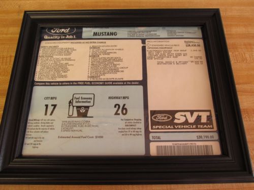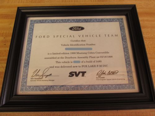All original documentation including the window sticker, SVT certificate, dealer booklet with owners manual and warranty info. (the car is no longer under warranty) Keys and key fobs are the originals. Car is spotless, was sold new in Illinois so it does have holes in the front fascia from the license plate bracket. The convertible cover flew off the car once so that has a few scratches on it. (previous owner) - Fresh from factory interior. - Fresh from factory body. - Fresh from factory paint (with no fading and no swirls in the clear coat). - Fresh from factory under body. - AC is cold. - Everything works. - Top is flawless. NO dings, NO dents, NO rust. Every owner (4) stored this car inside, under a cover and only drove it on nice days. It's like time traveling back to 1998 and buying this car at the dealer. Car has the following mods: (all done by me) INTERIOR: -Corbeau CR1 Ultrasuede and leather seats. (seat tracks are the dual locking Ford OEM tracks) -Pioneer DEH-X5500HD stereo -Ford OEM replacement storage tray (where the old CD player used to be). -All White LEDs in the instrument cluster and center stack (gives a bright true blue glow). -MGW short throw shifter -Billet shorty antenna CHASSIS and RUNNING GEAR: -Mustang Racing Technologies pneumatic hood supports -Bullitt pedal covers -J&M race rear lower control arms -J&M camber caster plates -Koni Str.t shocks and struts -H&R super sport springs -Off road H-pipe (forgot the manufacturer) -Nitto NT555 275/45/17 (have about 1,000 miles on them) -Ford Racing Power Parts Cobra rims -Locking lug nuts -New battery last month The shocks, struts, springs, control arms, and cc plates are all less than a year old. They were professionally installed and a correct front end alignment was done after. All of the interior pieces are less than 2 years old. Even though the car has no catalytic converters, I have not installed MIL eliminators. It takes a few months of driving before it throws a code and I just clear it out with my Innova scan tool. There are no other original parts available, I either sold them or threw them out. $500 non-refundable deposit due within 48 hours of auction end. Remainder due in cash when car is picked up. |
