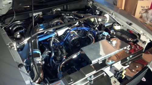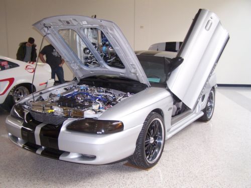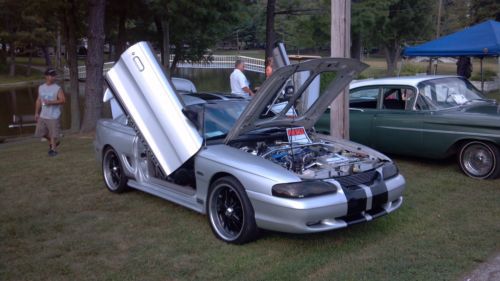 Performance upgrades. PI heads and cam typhoon intake manifold mac cold air under fender with air filter ford underdrive pulleys 3:73 gears 75 mm throttle body BBK shorty headers BBK off road H-pipe Imco performance mufflers (sounds awesome) Eibach drag launch springs (lowered car 1.5 inches) Appearance upgrades Painted black racing stripes Lambo door kit Misc. chrome engine parts Euro tail lights Billet antenna, fuel door, grill Chrome GT short throw shifter Three 10 inch JL audio subs 1500 watt MTX amp and capcitor (subs and amp needs hooked up) 20 inch boss wheels with cooper tires Black leather power seats This is a very nice one of a kind mustang and has done very well at many local car shows. All upgrades have been properly done and the cars whole life has been spent in a garage or covered (car cover included). I have never mistreated this car nor has it ever seen a track. The car is in excellent shape, but it is 16 years old so if you look close enough I am sure you will find a scratch or nick here or there. The only issues that I am aware of with the car is that is does have a little exhaust rattle that I haven't had a chance to fix. Also, the reason I have the amp and subs unhooked is because when hooked up there is a slow battery drain. I am guessing that there is a short leading into the capacitor or amp. Should be an easy fix, but I haven't had a chance to look for the wire that needs replaced. Rather than that, this is a great car. The reason I am selling is because I have another mustang that I have been working on and two toys are one too many. Buyer is responsible for shipping, but I will help where needed. This car is also for sale locally so I reserve the right to end the auction early if it sells locally. Please email questions or concerns. I can send additional photos if desired. Below is a link to a youtube video. Thanks for looking!