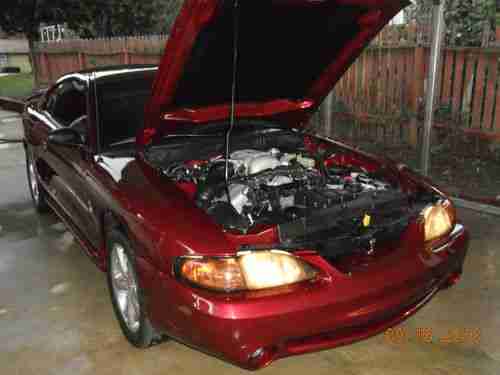 THIS IS A VERY CLEAN SVT COBRA, THE BODY IS STRAIGHT. UNDER THIS CAR IS VERY NICE.AND CLEAN . BLACK LEATHER INTERIOR HAS BEEN WELL TAKEN CARE OF NO CUTS OR HOLES . I HAVE OWNED THIS CAR FOR OVER TEN YEARS. I HAVE NOT HAD ANY PROBLEMS WITH CAR COBRA RUN AND DRIVES GREAT.. SHIFTS GREAT AND SOUNDS REALLY NICE, iT HAS A X PIPE 3IN STAINLESS EXHAUST MAGA FLOWS THIS CAR DOES HAVE A REBUILT TITLE. HAD MINOR DAMAGE IN LEFT FRONT WHEN BOUGHT COBRA WAS. REPAIRED BY A PROFESSIONAL WITH OVER 35 YEARS EXPERIENCE. PAINT IS BEAUTIFUL . REPAINT ALONE WAS OVER 4000. COME AND SEE IT . CALL ME 740 935 1870 SOLD AS IS CALL ME WITH ANY QUESTIONS that is a decal on the hood will come off if you dont like it