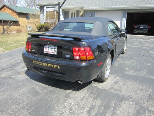 Listing this Mustang SVT Cobra for my father. The car is in good used condition. Black on black with a tan interior. Car has been stored on jacks during the winters and garage kept summers for the last 6 years he owned the car. Independent rear suspension, 320 horsepower, 5 speed stick, K&M air filter. Car is for sale locally and reserve the right to close the auction due to local sale. Clean title in hand. Any questions don't hesitate to ask. It's that time of year for a convertible. Don't miss out on this one!