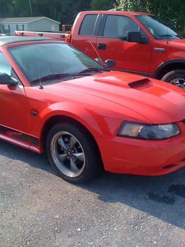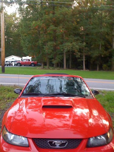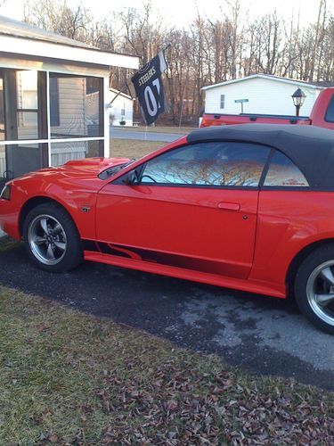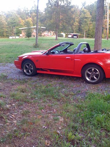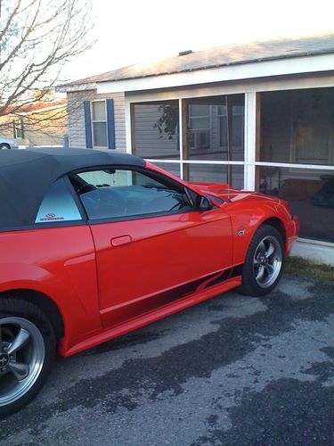 BEAUTIFUL, CANDY APPLE RED, MUSTANG CONVERTIBLE GT V8 GARAGE KEPT! Has new low profile tires, new battery, new fan, new alternator, oil has been changed every 3000 miles with synthetic oil. I ride with the top down, & AC running & I still get 26 MPG!, AC WAS just recharged, & RUNS SUPER COLD!. It has a MACH 1000 6 CD changer with subs that BUMP HARD. It also has a styling bar, cold air intake, mirror tinted windows,a STEEDA EXHAUST, YOU CAN HEAR ME COMING, BEFORE YOU EVEN SEE ME, chrome extensions, & mustang chrome wheels! Black leather seats,& I armor al my interior every time I wash & wax it. I do NOT drive this is the winter, or even rain. It has been garage kept, by me, for 3 years, & by the previous owner as well. I have only put 4500 miles on it since last inspection 5/13. I MUST SELL this car, & it is my baby, I do NOT beat it, ever. As I am 43...:) SERIOUS BIDDERS ONLY. I PAY $100 A MONTH TO STORE THIS CAR, AND I WILL BE RELOCATING, I MUST SELL! Make an offer, I will consider all reasonable offers, & I will take the best one. Thanks so much!....................................please email me for more pics. I have a few videos, so you can hear the sound, & see it better!
