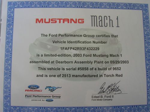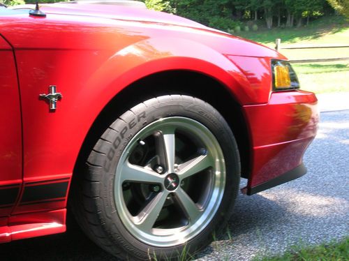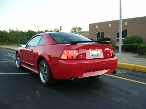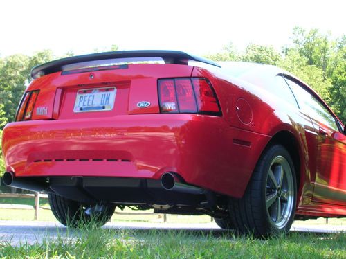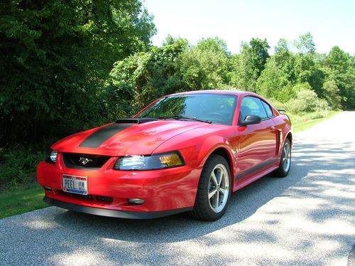 For your consideration Offered is a "Like New" 2003 Ford Mustang Mach 1 in Torch Red with 2,355 Miles. That is correct only 2,000 Miles. This Mach1 has been cared for meticulously. It is correct in every way. I do not know of a flaw in the paint or interior. It has been mistaken for a Brand New car. Please check out the detailed pictures which I have offered. This vehicle has never seen rain or snow & the car has NOT been molested with modifications. The engine is the Factory Original Ford high performance 32 Value V-8 motor as well as the Factory 5 speed Tremec 3650 transmission, drive train & suspension. The only changes made are the following: Magnaflow (magnapak) Catback Exhaust, Steeda Triax short throw shifter w/Hurst Chrome shifter & Hurst shifting ball. I also just replaced the aging Original Factory tires with Brand New Rousch RS-3 Performance Tires. All the removed parts will be included with the purchase if wanted. It has NEVER been in an accident & just passed the Ohio Emissions test. I could go on & on about this car, however if you are interested it can be viewed locally or you may contact me through E-Bay E-Mail & leave your cell phone # and I will promptly return your call . If you are truly interested in a Mach1 there are only a handful like this one in the U.S.A. This is NOT a run of the mill Mach 1. This car is something special! Please E-Mail with any questions. Thanks for the Visit! - Chuck