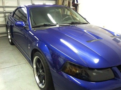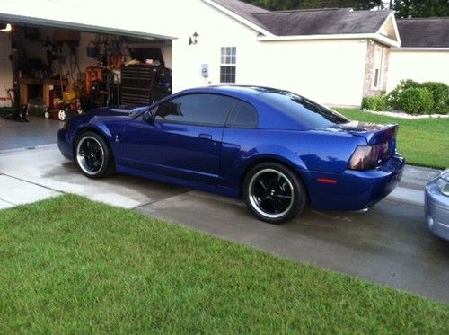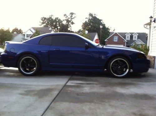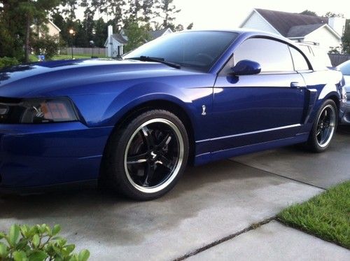 Up for bid is a 2003 Mustang Cobra 4.6 DOHC Supercharged with 6 speed manual trans with 71,762 miles. The vehicle has a rebuilt title and there is odometer discrepancies on carfax. I have owned the vehicle 6 months and purchased it for bracket racing but the vehicle was to nice to use as race car even tho the unfortunate history of it. List of mods include Kenne bell 2.8 supercharger at 20 psi, 60 pound injectors, cold air intake, upgrade MAF converstion good for 1000 hp, Metco idler pulleys, Accufab throttle body, long tube headers and Borla stinger exhaust no catalytic converters, six speed manual with upgraded shaft and shift forks, Ram clutch and flywheel, adjustable cable and clutch quadrant, Pro 5.0 shifter, tubular k member and control arms, front coilovers, adjustable caster/camber plates, 8.8 solid axle swap shortened one inch with 35 spline Moser axles, c clip eliminators, spool and 4:10 Ford Motorsport gears, Pro Comp differential support cover, adjustable rear upper and lower control arms, rear coil over converstion with Lakewood shocks in stock location, rear gt disc brake setup, subframe connectors. Made 600 rwhp on 93 octane. Rims are late 90's Cobra replica's 17 by 11.5 rear and 17 by 9 front with Nitto Drag radials and Nitto tires front. 12 inch wheels with 6.5 backspacing with 28 by 10.5 slick will fit nicely in fender since axle is shortened. All options function including air conditioning and cruise. I am open to any questions, thanks.