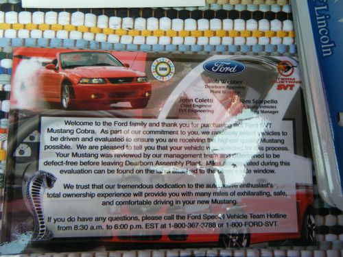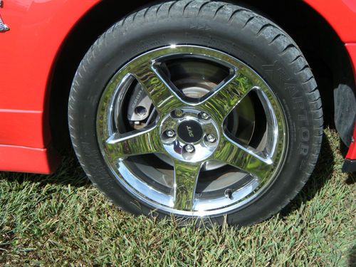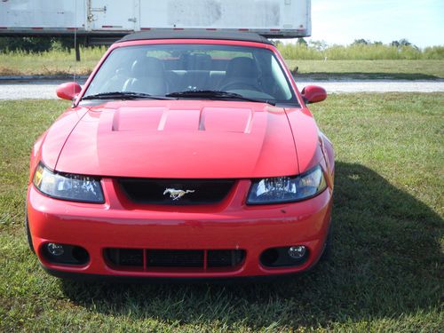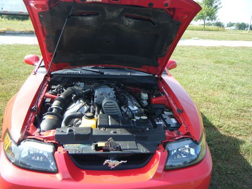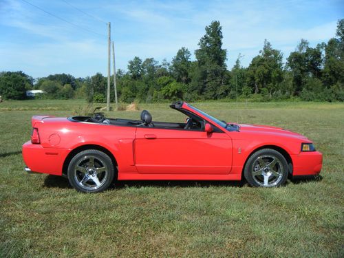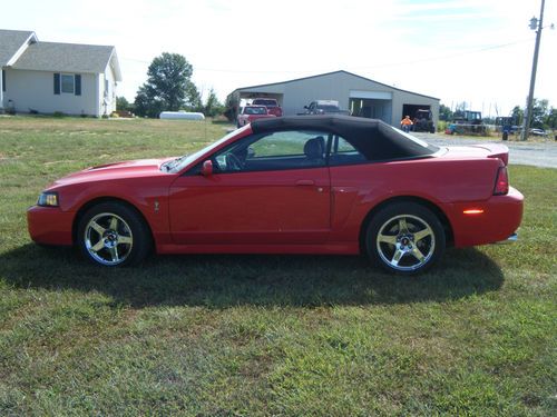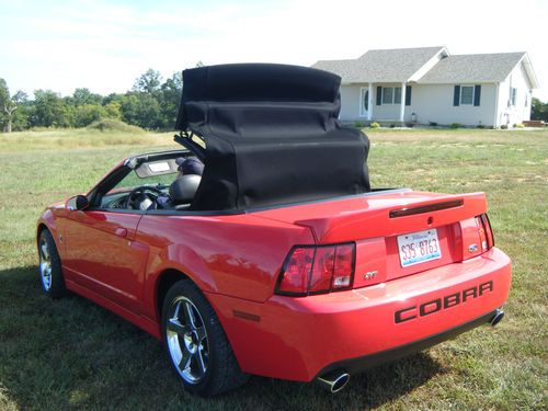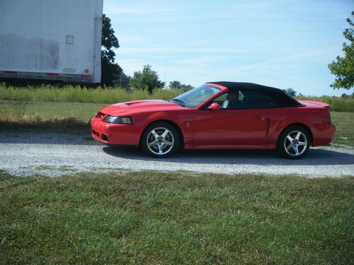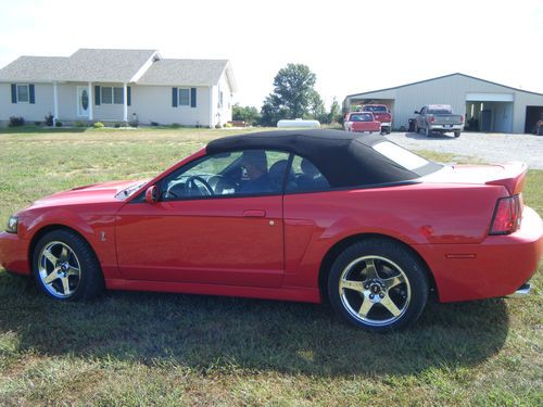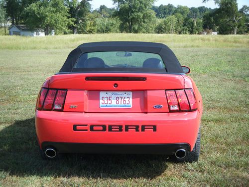 Up for sale is my 2004 Cobra convertible,IT IS ALL STOCK EXCEPT THE BORLA EXHAUST I PUT ON (I HAVE THE ORIGINAL IT IS IN GOOD SHAPE AND GOES TO THE NEW OWNER) The car is as right as rain, original,clean carfax,I am the second owner,tires are near new,runs and drives perfectThe interior is in way above average condition and even the suede in the seat inserts has no pilling and shows very minimal wear,all options are in working order.I HAVE THE CLEAN AND CLEAR ILLINOIS TITLE WITH NO LEINS ON IT.It of course has the supercharged 4.6 v-8 with the six speed manual trans,and like all the cobra's has all the available options.The car is as nice as you will find for less than 35K-I bought the car from a terminator fanatic who was a Georgia dealer right here on ebay this spring.The car has a few minor scuffs and a few small imperfections but is in WAY above average condition.I am selling the car because I have a barn full of other older mustang's (which my wife prefers) and I don't have the room to keep inside this winter and I don't want anything to happen to it to lessen it's condition.I welcome any questions and will do anything I can to help.There will be no test drives without full payment (I will be glad to take you for a ride in it to show it off) If I have left anything out just ask. Thanks,Ryan 618-528-7053