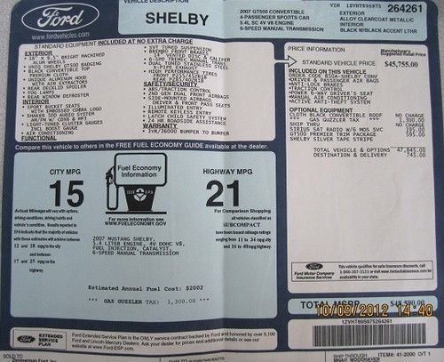 Car was also has "Ford Racing M-2007FR3SVT - Ford Racing Suspension Kits". Shelby specific suspension upgrade installed which lowers the car 1.25 inches and significantly improves handling ($1,470 parts plus installation). Aluminum lowering ladder bars