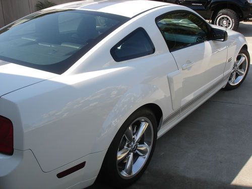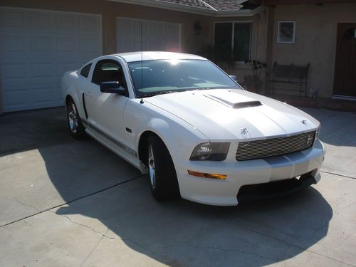 Here's a super clean low mileage Shelby GT in white with silver stripes and black leather interior. It has a tuned 4.6L with cold air kit and X pipe from Shelby and manual 5spd. and is highly optioned including the ford shaker 1000 watt factory stereo system. It has been meticulously maintained oil is always clear and underside of car is flawless and has never been driven in any moisture. I have the original window sticker and it is registered in the Shelby registry.