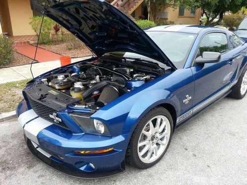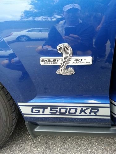 Very Rare 08 Shelby 40th Anniversary GT500KR. #264 of 1000 built. 1 of only 100 in Vista Blue. All options including Navigation. This car will continue to increase in value since the passing of Carrol Shelby. Very fast, no damage, warehouse kept. Lots of Carbon Fiber. All service records and all Shelby Certificates. This car looks and sounds amazing! Also included are 2 custom shelby covers, racing diff cover, diff catch can, camber adjusters, and the "white box" containing the brake duct kit.