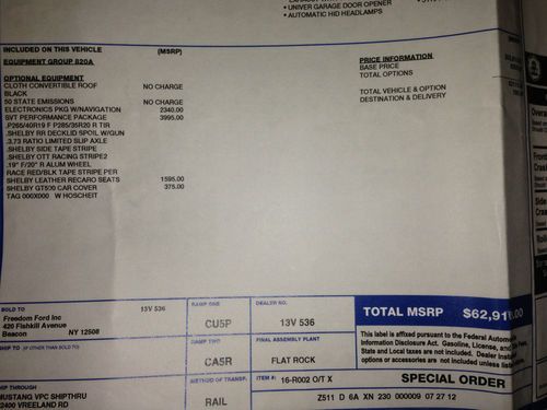 2012 SHELBY GT500 CONVERTIBLE. I AM THE ORIGINAL OWNER AND ONLY DRIVER OF THIS CAR. IT HAS LESS THEN 2400 MILES ON IT AND IS IN SHOWROOM CONDITION. THE CAR HAS NEVER SEEN RAIN AND IS PARKED IN A DEHUMIDIFIED GARAGE WITH ITS CUSTOM SHELBY CAR COVER ON WHENEVER IT IS NOT BEING DRIVEN. IT WAS A SPECIAL ORDER FROM FORD AND IS FULLY LOADED.