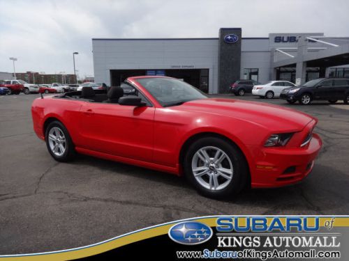 Subaru Stellar Care Award Recipient for outstanding customer service and satisfaction.Subaru of Kings Automall proudly presents this carfax 1 owner 2013 Ford MUSTANG 2dr Conv V6. Represented in RED and complimented nicely by its BLACK interior. Fuel Efficiency comes in at 29 highway and 19 city. Under the hood you will find the 3.7 coupled with the AUTOMATIC. The Word Around Town: The Mustang got an extensive redesign a couple of years ago, and it carries through with that same heritage pony-car look. Mustangs remain one of the strongest performance-coupe values for the money, thanks to prices that start in the low twenties and a bottom-line price of about $35k for a well-equipped GT Coupe. Additionally, Mustang Convertibles are one of the better picks for those who plan to make an impression when cruising and plan to carry passengers in the back seat. Meanwhile, the powerful Boss 302 version is the choice for those who plan to do weekend racing and are willing to give up a slight bit of comfort. Options and Safety Features: Nicely equipped with 4-wheel anti-lock braking system (ABS), AdvanceTrac electronic stability control (ESC), Driver/front passenger airbags w/occupant sensor, Interior trunk release, LATCH (lower anchors & tethers for children) system, Seat-mounted side-impact airbags for driver & front passenger w/head extensions, SOS Post Crash Alert System *Activates hazard lights & sounds horn upon airbag deployment*, Tire pressure monitoring system and 12 VOLT POWER SOURCE, AIR CONDITIONING, ALLOY WHEELS, AM/FM STEREO RADIO, ANTI-LOCK BRAKING SYSTEM (ABS), AUTO EXPRESS DOWN WINDOW, CENTER ARM REST, CENTER CONSOLE, CLOCK, COMPACT DISC PLAYER, CRUISE CONTROL, DAY/NIGHT LEVER, DUAL AIR BAGS, GAUGE CLUSTER, INTERMITTENT WIPERS, MAP LIGHTS, OUTSIDE TEMPERATURE GAUGE, POWER DOOR LOCKS, POWER MIRRORS, POWER STEERING, POWER WINDOWS, RADIAL TIRES, REAR WINDOW DEFROSTER, RECLINING SEATS, SIDE AIR BAG SYSTEM, STEERING WHEEL AUDIO CONTROLS, TILT STEERING BEFORE YOU COME TO THE LOT TO LOOK AT A PARTICULAR VEHICLE, GIVE JEREMY VASKE A CALL @ 888-210-8460. THIS WILL ENSURE THAT THE VEHICLE IS HERE ON THE LOT AND READY TO SELL. WE ALWAYS TRY TO ENSURE THAT ALL INFORMATION ON THE VEHICLE ARE ACCURATE. PLEASE ASK TO SEE THE CARFAX ON THE VEHICLE THAT YOU ARE INTERESTED IN. THANK YOU FOR VISITING OUR VEHICLES AND HAVE A GREAT DAY.