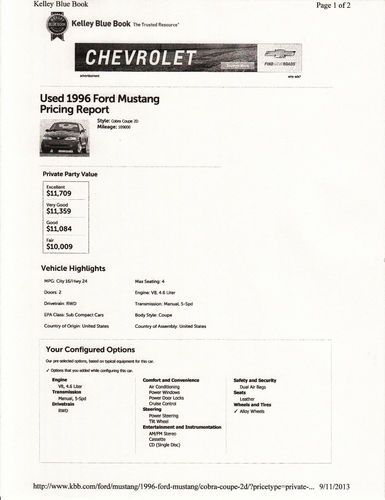 109K miles. 4.6L DOHC V8, 5 speed manual trans. 100% rust free. Runs and drives great, looks great. Everything works (except drivers power seat). Cold AC power windows, locks, mirrors. CD Player, keyless entry, cruise control. New radiator, water pump, alternator, and battery. Tires have over 90% of tread left, Flowmaster exhaust.