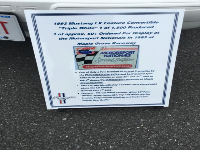 1993 MUSTANG FEATURE TRIPLE WHITE 9th ANNUAL FORD MOTORSPORTS EDITION FROM MAPLE GROVE RACEWAY Please read entire ADD For Sale 1993 Ford Mustang Triple White Feature Edition Convertible Automatic with 36,000 original miles, it is one of 1,500 triple whites produced in 1993 but it is also one of about 50 that were ordered for display at the 9th annual ford motorsport nationals in 1993 at Maple Grove Raceway. Very little is know about these cars but I do have a folder that goes to buyer with info about the maple grove cars, they had a decal above the 5.0 emblem that was most always removed when the cars finally went to dealerships, I had the decals reconstructed from an original, I also ordered a Marti Report for the car and the Marti report states that the car was ordered from the Philadelphia DSO office as a Local Promotion all and only the Triple White Maple Grove cars where ordered this way, the car was also built in April of 1993 This is a very very clean Triple white no rust at all trust me I have a lift in my garage and have had it on it many times for storage and to keep the undercarriage clean.