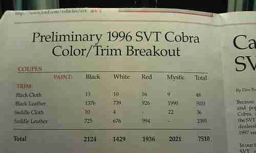Purchase includes original SVT certificate signed by TS BOYD (Ford SVT team leader) and OJ COLETTI (manager of special vehicle engineering). That certifies that this VIN is a LIMITED EDITION 1996 Mustang Cobra assembled at Dearborn, Michigan assembly plant on 08/17/1995. THIS VEHICLE IS #175 OUT OF A BUILD #7496.