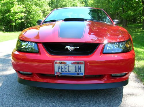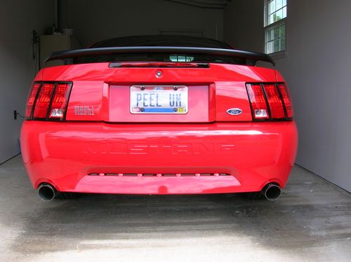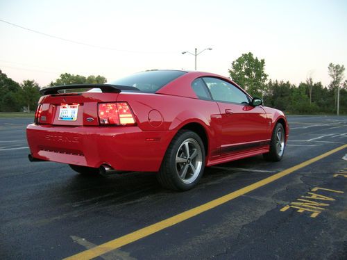 For your consideration Offered is a "Like New" 2003 Ford Mustang Mach 1 in Torch Red with 2,355 Miles. That is correct only 2,000 Miles. This Mach 1 has been cared for meticulously by a Non-Smoker. It is correct in every way. The Mach 1 is Flawless both in & Out. The Car has been Stored/Covered-garaged with a battery tender & Gas stabilizer added when not in use. The body, paint & under the hood are flawless & the undercarriage/wheel wells are spotless. The car has NOT been molested with modifications to spoil its Originality. The engine is the Factory Original Ford high performance 32 Value 4.6 CID V-8 Engine as well as the Factory 5 speed Tremec T-3650 transmission, drive train & suspension are all Stock. The only changes made were the following: Magnaflow (magna-pak) Cat back Exhaust, Steeda -Triax short throw shifter w/Hurst Chrome shifter & Hurst shifting ball. The original exhaust & shifter parts will go to the new owner. I also just replaced the (aging rubber) Original Factory tires with Brand New Roush RS-3 Performance Tires & it rides Great. It has NEVER been in an accident & just passed the Ohio Emissions test. It has had ALL the fluids refreshed by my Local Ford Retailer as well as a New Ford Motor craft Original replacement Battery. If you are interested it can be viewed locally or you may contact me through E-Bay E-Mail & leave your cell phone # and I will promptly return your call . This is NOT a run of the mill Mach 1. This car is something special! NO Disappointments. Please E-Mail with any questions & Viewing. Thanks for the Visit!