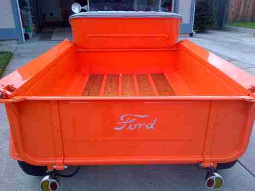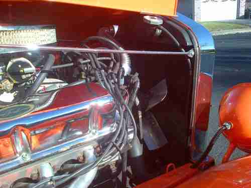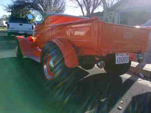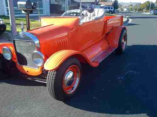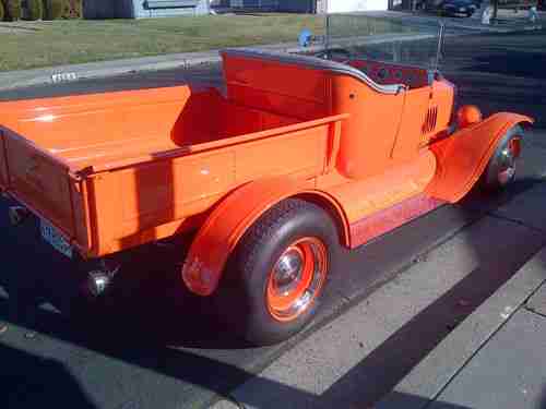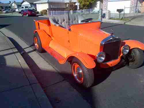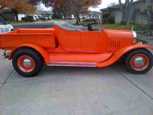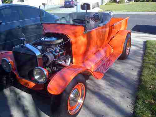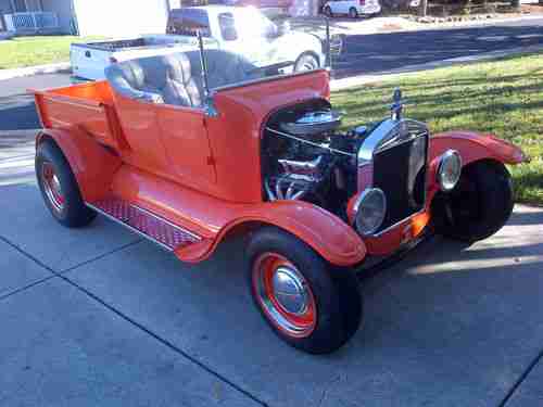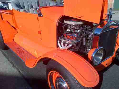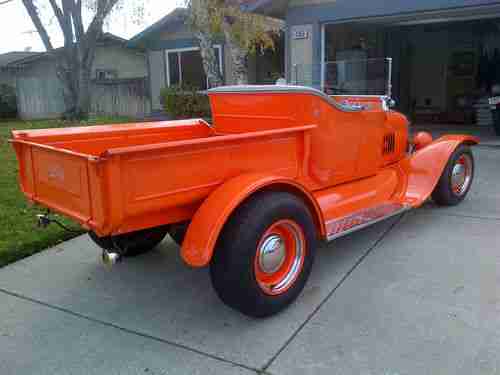 I have a very sharp 1927 Model T Ford Roadster Pickup up for grabs. This truck is titled as a 1954 special construction and that is when it was originally brought back to life. It has a healthy 302 V8 with a C4 tranny and 8 inch rear-end.This truck was off frame and the frame was custom fabricated at a professional shop to help support all the new drive train. This is an all steel truck with the transverse ford style front four link suspension with disc front brakes and four link adjustable rear suspension and the running boards are chrome. The gas tank is hidden below the seat and I believe it is 15 gallons. There is nothing on this truck that has not been touched. It is a clean, solid, good running and driving truck that gets all the thumbs up while driving down the road with the competition orange paint. It has all the needed Stewart/Warner gauges, Speedo tach, oil, water temp, amps and fuel that all work. It has a tilt steering column and the blinkers, lights and horn are all controlled using the switches on the column. The wood in the bed is new and awesome. The total rebuild was completed in 1998. When looking at this truck it appears new, it is still a used vehicle which has no warranty expressed or implied. No returns or refunds and the shipping or the pick up is the responsibility of the buyer. I know that there's a lot of little details I am missing but the bottom line is that this is a great running truck that turns a lot of heads. For any questions before bidding you can email or call me @ 925-382-5078