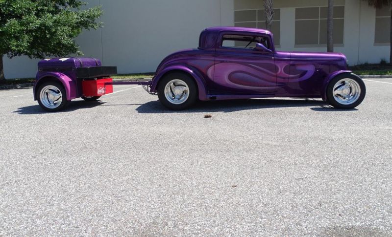 This sweet ride was completely built from the ground up but the father and son with great craftmanship. This 32’ 3 Window coupe is dashing and shows a lot of character. This sweet ride was hand built from the ground up. Its body features a fiberglass shell with custom rectangular frame and tubular 6 point roll bar built into the hotrod. With custom pop out head lights, fenders and even traffic skylights to make sure you don’t miss the light turning green. This one has been painted in a stunning diamond base purple with custom pink decal that has been cleared over to give the car a bold look!