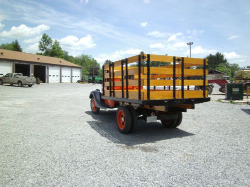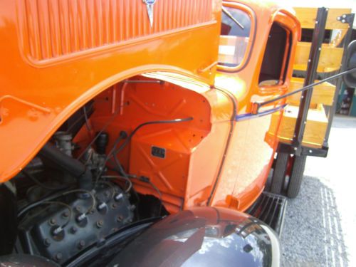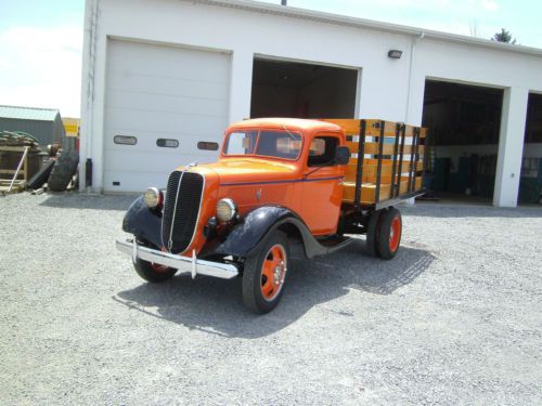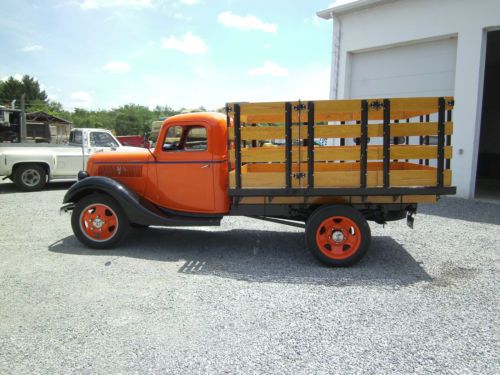 FOR SALE> 1937 Ford 1 1/2 Ton Stake Body Truck..............This Truck was an original Gulf Oil Company delivery truck........Purchased in 1981 from 2nd owner.....Original 15,000 mile truck when purchased.......Truck was purchased for an addition to a Private Early Ford Collection (1932-1940 Ford cars and trucks). The truck was completely disassembled and Frame Off Restoration performed. Truck was sand blasted...epoxy primed and restoration started. All wood on bed was replaced....stained and poly urethane clear. Rust free cab and fenders were prepped for paint. Cab was painted Gulf Oil Company colors of orange cab with blue band on cab......black fenders and chassis and parts painted black. Flat head V-8 engine was rebuilt, 4 speed transmission was cleaned and inspected...rear end assembly cleaned and inspected......mechanical brakes replaced, all running gear gone thru......original radiator was sent out and hot tank and inspected....original gas tank was hot tanked and sealed. Truck is refinished in acrylic lacquer.....chassis was refinished in urethane........all new glass installed......new interior installed....This truck is equipped with original Gulf Oil Tires ( tires are weather checked...hold air and no leaks) VERY RARE TIRES.....................Restoration was completed in 1983 and truck has been stored in climate controlled building with 12 other EARLY FORD V-8 Collection.....1937 Ford 1 1/2 ton stake body....original 15,811 miles...frame off restoration....orange and blue cab...black fenders....single left side wiper....single left side exterior mirror....new glass...new interior....new oak on bed....stainless bolts on bed....Rebuilt flathead V-8....4 speed transmission....mechanical brakes....new battery......professionally maintained since restoration. This Truck would make a great addition to Gas Station collector.....parades...or truck collector...........SEND your appraiser to inspect. Buyer must make arrangement for shipping ........Wire transfer to our bank for payment.....Selling to settle estate.........................