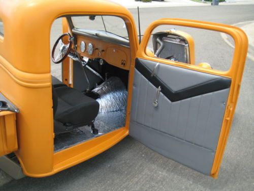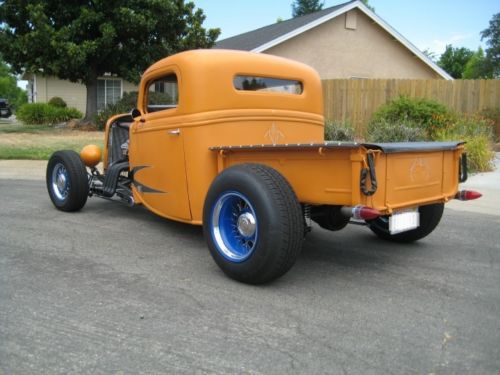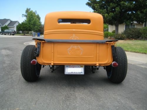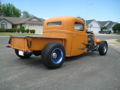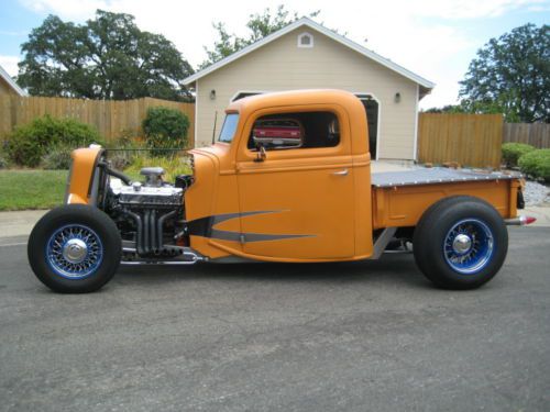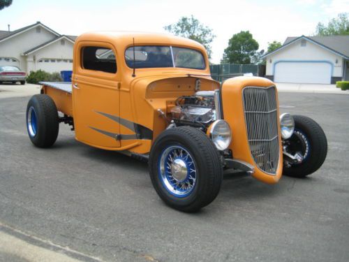 This is a beautiful 1937 Ford Rat Rod Pickup. It's ready to go! Chopped and channeled - 350 c.i. SBC - TH400 transmission - 9" Ford rear end - Edelbrock carb and intake - HEI distributor - Aluminum radiator - Painless fuse panel - 2" x 3" rectangular tubed frame - Pete and Jakes 4" dropped front axle - Chromed hairpins - '35 grill - '33 headlights - Caddy tailights - Rear coilovers - Lokar shifter , throttle , oil & tranny dip sticks - Aluminum fuel cell - Bucket seats - Big and little wire wheels - Sanderson Zoomie headers - Satin orange paint with custom pin striping - Chrome tilt column with banjo steering wheel - Clear calif. title - Very clean truck. Contact ray @ (530) 244-7120 for more info. Thanks for looking!