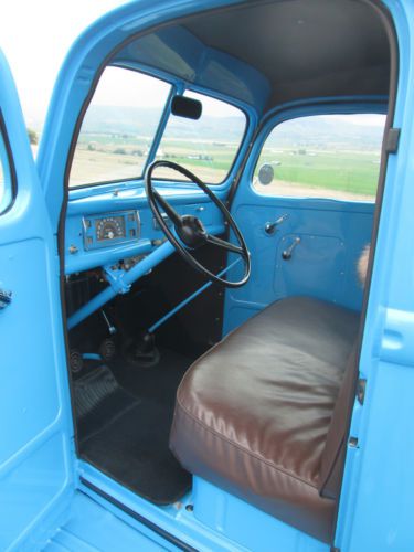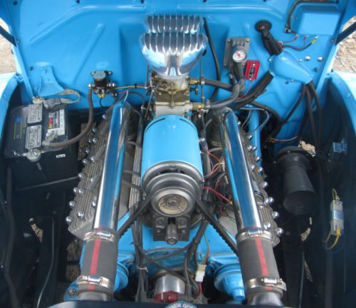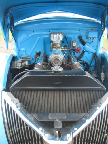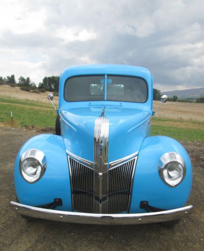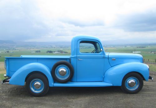 1941 1/2 ton all-steel Ford pickup. Frame-off restoration, everything sand-blasted and carefully restored to be the quality pickup it is. All new glass, window felts, channel and trim. Engine is a 1946 flathead 59AB, completely rebuilt with a new Walker radiator. The rear-end has 3:78 gears that makes it nice for highway driving. The new paint is PPG "big league blue" with platinum pearl, and solid oak bed panels. Original cowl vent works great. All new brakes, bearings, wheel and master cylinders, and brake lines. Front and rear lights updated with turn signal switch by Francis wiring. The truck is 12V, with electronic ignition, halogen headlights, and pre-wired for anything you might want to add. New front tires: 215/70R15. New rear tires: 235/70R15 on reverse rims with 5 on 5 1/2" bolt pattern. Dual exhaust with new Fenton headers. Always garaged. This truck runs great and is fun to drive. It only has about 300 miles on it. Serious inquiries only. E-mail me your number if you have questions. Shipping is the buyer's responsibility. |