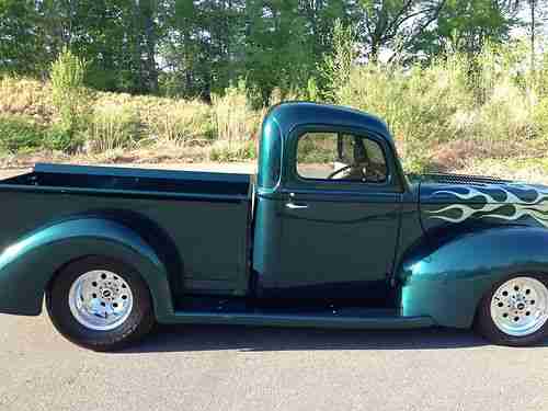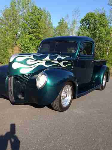 Fatman Fab built tubular chassis with coilovers on all 4 corners w mustang based front and 4 link rear. 1941 Ford pickup pro street w 460 big block w aluminum heads and intake, Sanderson Streetrod Headers, 3 chamber Flowmasters. Griffin radiator with tranny cooler matched to HP. NO cooling issues. Runs great on 93 octane. Ford built C6 w TCI converter and driveshaft built to match engine. B&M shifter. Ford built 9" posi Trac rear end w 390 gear. 2" top chop by Fatman Fab as seen in Street Rodder Mag. PPG Ford deep emerald green w silver flames and lime green pin striping. All flames, striping and V8 logo are painted on with gun not brush. Hood and inner fender wells are louvered. Hood de chromed and peaked. Custom recessed and smoothed fire wall. Custom built dash with tilt steering. V8 logo head liner with flamed door panels. Pioneer speakers in rear panels and wired for stereo. No stereo or heater. Your choice. Low profile seats with Simpson lap belts. Optima battery w custom hold down and hidden battery disconnect. Polished 20 gallon fuel cell. Red oak, polished strips and tubbed. Pro's Pick bed w tear drops on all 4 corners. Custom rear roll pan with 39 tail lights. Ford 39 headlights. Polished aluminum Weld Wheels with BFG's. *All components are either new, remanufactured or rebuilt*. Truck is sold as is with NO warranty. If you have questions please ask and pics don't do the paint job justice. If you want a Streetrod truck that turns heads and runs and sounds as good as it looks this is it!