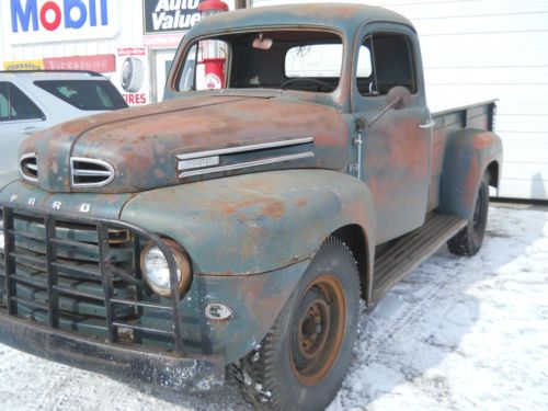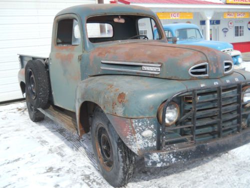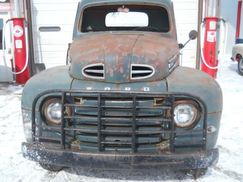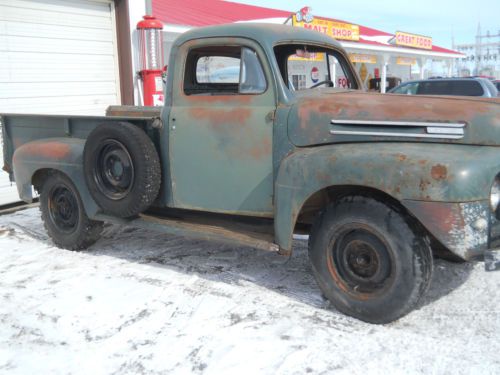THIS IS A 1949 FORD F-3 PICKUP; IT COMES FROM A 25 PLUS YEAR STORAGE IN SOUTH DAKOTA; THE MOTOR IS STUCK. AND MISSING CARB . ACTUALLY WHAT U SEE IS ALL I HAVE. THE TRANNY IS NO GOOD. THE WINDSHIELD IS NOT PRESENT. NOW THE GOOD ; THE BODY HAS EXCELLENT PATENA, SUN BAKED. NOT BAD AT ALL FOR RUST; HAS SOME BUT AS U CAN SEE IN PIX'S, THIS IS GREAT METAL TO START WITH. THIS WILL NEED TOTAL RESTORATION. CHECK OUT THE BED WOOD. LOOKS TO BE IN GREAT SHAPE; NO TAILGATE. NO RADIO. FOR QUESTIONS, AND HELP WITH A SHIPPING QUOTE CALL 218-464-2821 JEFF |