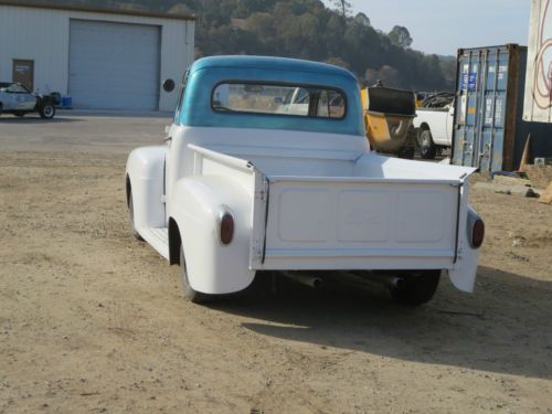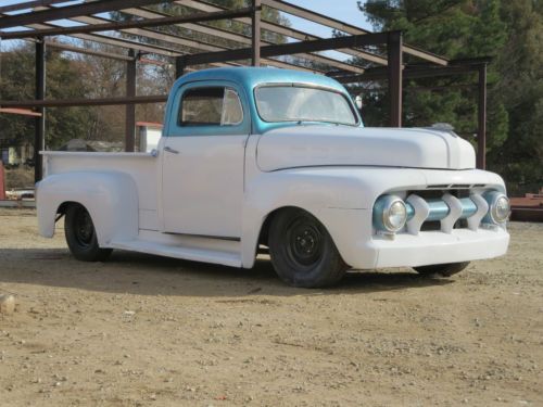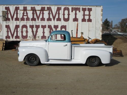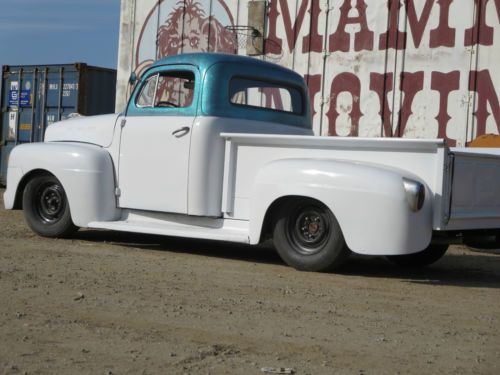 Up for bid is my 1952 Ford F1 pickup. I would love to keep it and cruise it around but the land lord says I have to many cars so it must go. Here is a list of what has been done: - The top was chopped two inches -Blue metal flake roof -shaved trim -Lowered (axles swapped to top of spring) -New wood in bed -Crate Buick 350/350 trans -new aluminum Radiator -1951 Lincoln carb adapted to fit the bigger two barrel -Ford 9 inch -Metal flake grille -New wiring -1950 Packard taillights -Shaved bumpers -California Rust free car -Plymouth hood ornament This truck is a perfect running, driving custom truck that gets a lot of attention every where it goes. The body is not perfect but is perfect for a driver. The suspension feels like a stock truck and goes down the road straight. As you can see in the pictures there is a wheel stud missing on every wheel, this will be fixed by the end of the auction. Like an idiot I accidentally cracked the front window putting it in, fortunately its only on the passenger side and its only flat glass so its very easy to get new glass cut for it, I spend forty dollars for it. The door roll up glass is not installed but the passenger side is cut. All the other glass is there, wing windows back and front. I got the motor from a friend who told me it was a crate motor that was purchased in the 90s for his 54 merc but someone told him a chevy was better so it was pulled out. The motor supposively has only 1500 or so miles, but I have no way of proving this, but it runs very strong and shifts great. Before I got the truck someone had put ford 9 inch in. The top was chopped 2 inches with leaning the back window forward slightly to make up for the shorting of the roof. There is no overlayed metal and everything is completely welded. The 1950 Packard taillights were trimmed to fit the curve of the rear fending and give it a very custom look.
