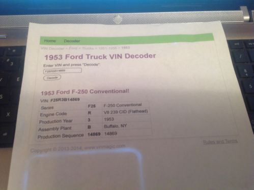 True Barn Find, or should I say, outside the barn :)! This truck was located parked outside a barn in Michigan. I purchased the truck to resell as I do not have the facility or time to rebuild it. This is a 1953 F-250 Conventional with the 239 CID V8 FLATHEAD!!! I ran a decoder check on the vin (see pic) and found it was 14869 in the Production Sequence, assembly plant of Buffalo, NY. This truck has a good frame, the engine and transmission as well as drive train appear to be intact. The front windshield has a small break that appears to have been made, like from a stone hitting it. The rear glass has not breaks or cracks. Side windows are gone and wing windows are broken. A lot of rusted body parts as you can see in the pics. Front grill has a rusted hole on the drivers side but still is usable with a little work. Bottom of the doors are rusted and gone. Bed was a wood bed and is of course gone as well. Steering Wheel, odometer and gauge area not bad, as well as various interior knobs and handles. You can see the vin plate is still attached to the glove compartment door. Many usable parts, mainly the frame, engine, trans, and drive train and don't forget the wheels. Would be a nice restore from the frame up. I CAN MANUALLY TURN THE ENGINE OVER BY HAND ROTATING THE FAN BLADE, SO THE ENGINE IS NOT SEIZED UP. ALTHOUGH THE SPECIFICS OF THIS LISTING SHOW A SALVAGE REBUILDABLE TITLE (had to put something our it would not take the listing) I DO NOT HAVE A TITLE FOR THIS TRUCK...I DO HAVE A BILL OF SALE AND I WILL PROVIDE A BILL OF SALE TO THE WINNING BIDDER! I can deliver the truck and will give you a quote for delivery US ONLY. Simply shoot me an email with your address or city and I will respond with the delivery quote. NO RESERVE!!! Good Luck Bidding! |