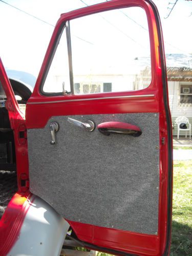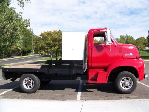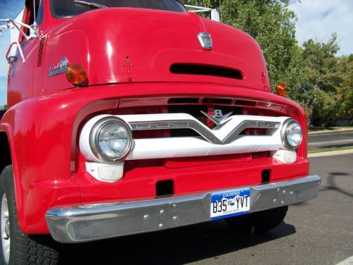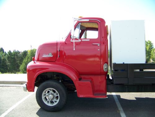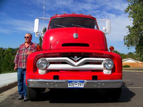1955 ford C-800 cab over truck. Cab is mounted on a 1989 ford econoline 350 van frame. Coil spring front suspension, leaf rear. All new brakes and brake parts. Disk front, drum rear.Flatbed is all wood construction and measures 10' long x 7'2" wide. Electrical system has been converted to 12 volt and everything functions. Engine is ford 391 ( no, not a 390) from a F600 with a ford 5 speed manual trans. The 5th gear is believed to be direct drive, not overdrive. Tires are 265/75/r16 on aluminum wheels. Rear axle is believed to be 3:73 ratio. Power steering, power brakes, hydraulic clutch. Dual exhaust. Has receiver hitch with brake controller. Was built in September 2012. 38 gal gas tank. Box on the bed is storage for spare tire and tools. Can remove the box if you don't want it. Has cb and radio/cd player. The seat was redone, but has a funky spot that shifted at the driver side corner. The rear window is made of wood, but a glass replacement can be purchased through LMC for around $80 with new rubber. Not quite show quality, but still a rare truck that is fun to drive and turns heads. Paint looks good from a couple feet away but is not show quality, but we are not asking for a show truck price tag. Runs great and needs nothing. Located in Denver Colorado. We can work with your shipping company if you need it shipped. Winning bidder must deposit $500 into PayPal within 48 hours of auction close. Balance in Cash upon pickup or before shipping. No warranty is implied. I'm listing this for my father, but I can answer any questions. Kris at 303-332-2776.