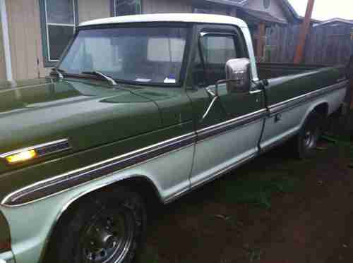 THIS IS A 1971 FORD NOT PERFECT BUT IS IN GRATE SHAPE NO RUST EXCEPT FOR IN BED AND VERY LITTLE CLEAN CLEAR TITLE... THIS TRUCK HAS HAD ONLY TWO OWNERS ALL REGULAR MAINTENANCE WAS DONE NEED THE MOTOR FINISHED STARTED REBUILD NEED INTAKE GASKET KIT.NEW PARTS ARE FUEL PUMP RACING HEADS AND CAM VERY CLEAN FOR ITS AGE PLEASE DONT ASK ABOUT CONDITION IT IS A CLEAN TRUCK THE PICS ARE ACCURATE NEVER RE PAINTED IT IS ALL ORIGINAL