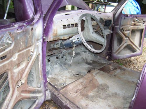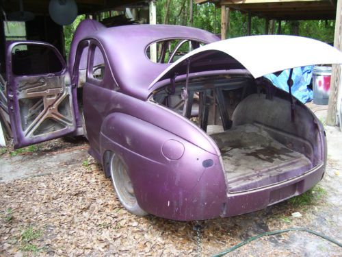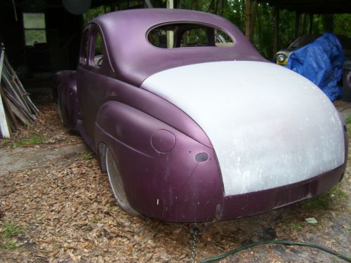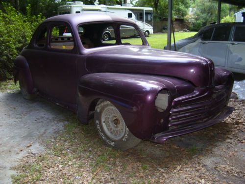 1947 Ford Business Coupe (short door). The body of this hotrod is ready to send to the paint shop. Doors and trunk are shaved and firewall is clean. License box is molded into body. Body has base coat all over and clear coat on nose. Needs a bit of work on scratches and chips and of course will need to be resprayed. Frame has Chevy front subframe and parallel leaf springs in rear. Axle has empty pumpkin. Body is lightly bolted to frame at this time. An '84 Corvette 350 ci motor that currently has crossfire induction is provided. The good running motor has 94,000 miles and is intended to receive a standard manifold with new Edlebrock carburetor and headers and to be mated with a supplied 350 tranny. Equipment supplied: Pair of really nice leather SUV seats that are at correct height for this car, driver seat is power and passenger is tilt for access to rear area of car. Windshield rubber and moldings, door and rear glass, garnish moldings, new power brake booster, master cylinder and pedal box. A complete dash and extra gauges are supplied as are springs and disc brake calipers. A complete rear axle and front (wrecked) subframe with brake calipers, coil springs, differential, shocks and steering are also available. A set of never used 2007 Mustang GT wheels and tires (will need wheel adapters) are also supplied. A new wiring loom and fuse panel and original radio are as there. This is a rare opportunity to build a great car without having to go through enormous body work and expense and to have a car that is getting very hard to find. For questions, call John at (904)993-0826. Car is sold as is, where is.