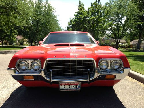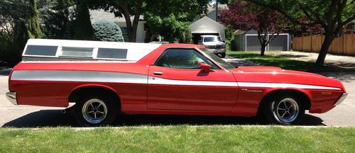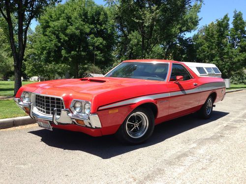 **NO RESERVE** Beautiful 1972 Ford Ranchero GT w/ Extremely rare 351 Cleveland-4V "Q" CobraJet Engine! Has Factory AC, Magnum 500 wheels, Hood scoop, Automatic Transmission, Power Steering, Power brakes, Factory Gran Torino silver & black stripes w/ red paint. Never been re-painted! Body is all original & in good shape for being 41 years old! True Survivor!!! . One family owned entire life of vehicle. Very rare and very hard to find "Q" code car, especially in this condition. I'm selling this for my mother. You may speak to her on the phone or email if you have questions. I will also try to help the best I can. She just does'nt do Ebay. This was her fathers car. It's Beautiful inside & out. True Head Turner! We have original paper work from the dealership. Ownerscard w/ Tin Vin plate, Temp Tag from dealer, Factory build sheet found recently under seat, in perfect condition, registration cards since 72, Original owners Manual & much more. This Ranchero as to be expected has a few minor door dings & dents here & there. Please refer to pictures. Nothing major for being 41 years old. No wrecks. Never been repainted. No rust other than a small bubble by the passanger wheel well, but my GrandMother siad it has been this way since the early 70's. The Story goes. My grandmother & grandfather went on a road trip to Vegas from Socal & they hit snow on the 15 around Barstow. There were people selling their services & putting on chains ,on the passing cars. My Grandfather being from Socal had never used chains before. He let the man put them on & then later, let another take them off, once they were out of snow a few miles down the raod. After awhile they heard a sound but thought it was normal for chains, as he had never used them. When the man took them off, thats when he noticed the damage to the wheel wells. (see pictures) My mother thought it might have been worse and maybe fixed from what she rememberd but my grandmother told me today (june 30th-2013) that the damage done was the damage you can still see today. My grandfather never fixed it. Near perfect from 20 feet away. 1972 Ford Ranchero GT, 351 Cleveland-4V, V8, Automatic, PS, PB, Factory performance cluster gauges, Very Rare Factory installed A/C, Rare factory installed magnum 500 rims w/ matching spare & all center caps included, all are like new! The seat upholstery was recently replaced, custom to match factory spec. Only the 4 top inserts needed replacing, everything else is original. (Backs, sides, bottoms, & middle all original). Headliner and Carpet is suburb & all original. No cracks, or rips & stiching is perfect! There are "chicken feet" on the dash. Clean undercarriage & engine bay. Runs and drives Great! This Ranchero is in amazing condition for her age! Has near new mufflers and pipes. Rides and drives like new and sound's even better! Perfect color combo. It also has carpet liner in truck bed. There are no major dents or signs of rust or paint damage in the bed. The "gem top" shell, (Very rare) was put on at the Ford dealership in 1972 & has never been off.