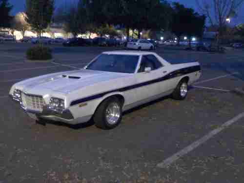 VERY GOOD CONDITION 72 RANCHERO GT. RUNS SUPERBLY. STARTS ON ONE CRANK AND HAS NO HESITATION AT ALL FROM COLD. ORIGINAL 351 CLEVELAND MOTOR, ORIGINAL CARB RECENTLY REBUILT. RECIEPTS FOR THE PAST 20 YEARS ON REPAIRS AND MAINTENANCE. BRAND NEW VINAL INTERIOR AND $800 DUAL EXHAUST WITH X CROSSOVER TUBES AND FLOWMASTERS. NEW BED COVER AND BED SPRAY. PAINT IS ABOUT 25 YEARS OLD AND HAS A FEW PEELING SPOTS BUT CAR LOOKS GREAT, VERY STRAIGHT BODY. HAS ALARM WITH 2 REMOTES. ENKE ALUMINUM RIMS, TIRES ARE FAIR. SPEEDOMETER IS NOT WORKING. CAR HAS A SALVAGE TITLE WHICH I DO NOT KNOW WHY, BUT I DOUBT IT HAS EVER BEEN DAMAGED AS IT HANDLES AND DRIVES REALLY NICE AT ALL SPEEDS. CAR IS LOCATED IN CALIFORNIA. THIS IS A REALLY NICE LOOKING AND GREAT RUNNING 72 "FISH MOUTH GT". NEEDS NOTHING EXCEPT SPEEDOMER FIXED, HAS TAGS PAID THRU NOV 2013.
