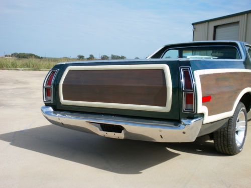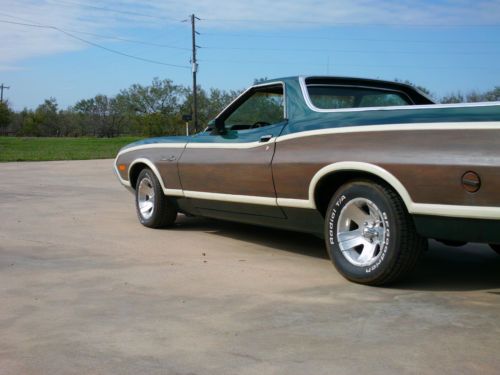 1972 Ford Ranchero Squire. 351 Cleveland. C4 automatic. PB. PS. This truck came from dry Las Vegas and there is no rust that I have seen. Old carpet was taken out and the pans still have the original factory paint. This is a solid, solid truck. Recent repaint and the paint is very nice. Not show quality but very nice. Woodgrain looks pretty decent too, but looks better at 10 feet than close up. Nice wheels and tire. Front bumper has a small dent on the left corner. The truck runs great and I took it (on the freeway) to a local Fairlane/Torino show a few weeks ago. Starts right up. Stops good. Runs down the road good. Interior is good to very good. I put new carpet, kick panels and window cranks in it. Good headliner. Door panels look good. Headlights, taillights, stoplights work. Wipers work. Horn tries to blow but is very weak. Gas and temp gauges do not appear to work. A couple of the side marker lights are out. Windshield has a chip. This truck needs a few little things but is an above average daily driver ready to be enjoyed. Here is the door tag numbers that I can read: Body: 97K Color: 4Q Trim: NR Trans: W
