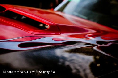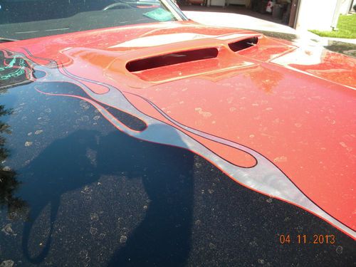 Outside there's custom dupont paint with red black and burnished silver flames(ignore the dirty hood in the close up of the flames). it was painted about 8 years ago and although it has been used as a shop truck and daily driver it still looks good (some nicks and scratches etc but a great 30 footer)still turns heads every time out. There is rust thru in the floor but it's been that way for years and doesn't really affect the car but the pans should be done to make it right