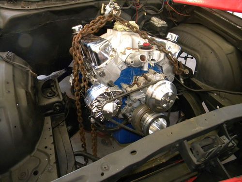 The motor was built for our drag car with all the good stuff, Dart II heads ,isky cam, solid lifters, roller rockers,Eagle rods, forged pistons, Edelbrock intake, 830 CFM Holly carb, Mallory Unilite distributer.chrome and billet dress up items