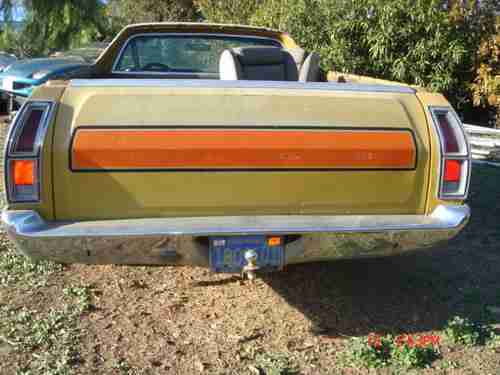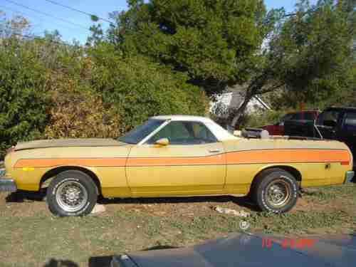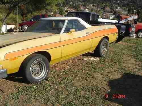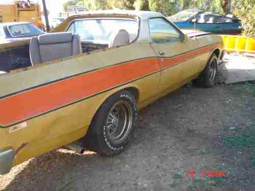 1974 Ranchero GT all original, 351 Cleveland automatic, A/C, 8 track player, new 8mm spark plug wires and spark plugs, distributor cap, distributor rotor, kyb shocks front and back, fuel pump, battery. AC need charging, has rt quarter panel dent (see pics) light rust on roof, needs bed hocky stick installed and are included in sale. Strong Engine sound great, runs well. Bed is straight as can be see pics!! missing trim on front , missing one air vent, carpet needs replacement. Also, included in sale are the True Wire rims. the rear fit the front need set need rim extensions.